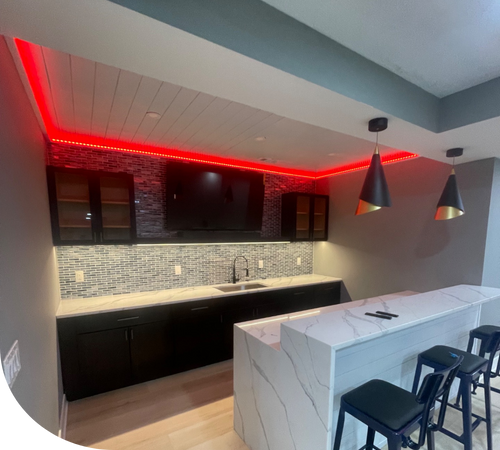 Complete basement conversions with bathrooms, bedrooms, bars, and family living spaces.